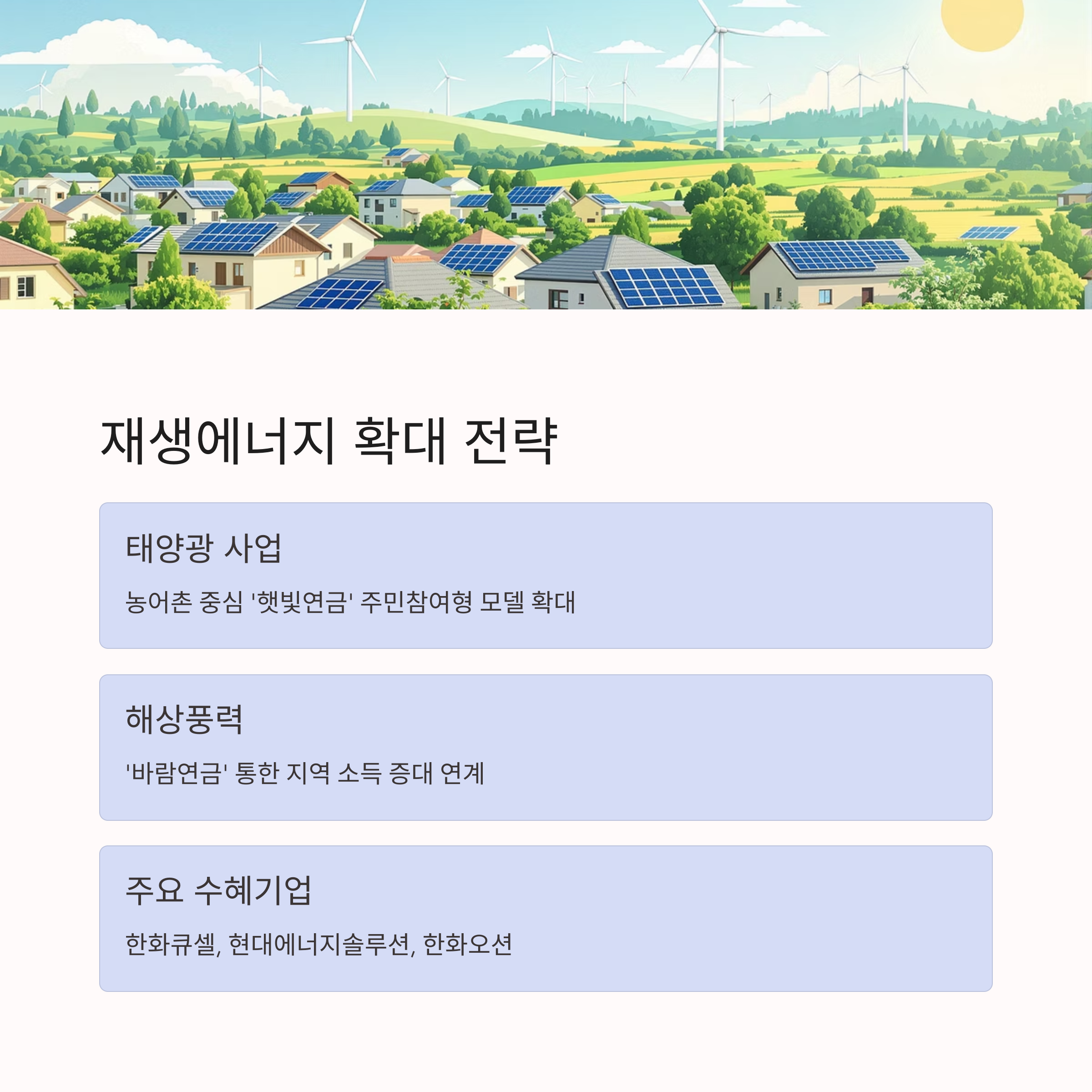 특히, 농어촌 지역을 중심으로 ‘햇빛연금’과 ‘바람연금’으로 불리는 주민참여형 태양광·풍력 사업을 확대하여 소득 증대까지 연결하려는 전략이 눈에 띕니다.