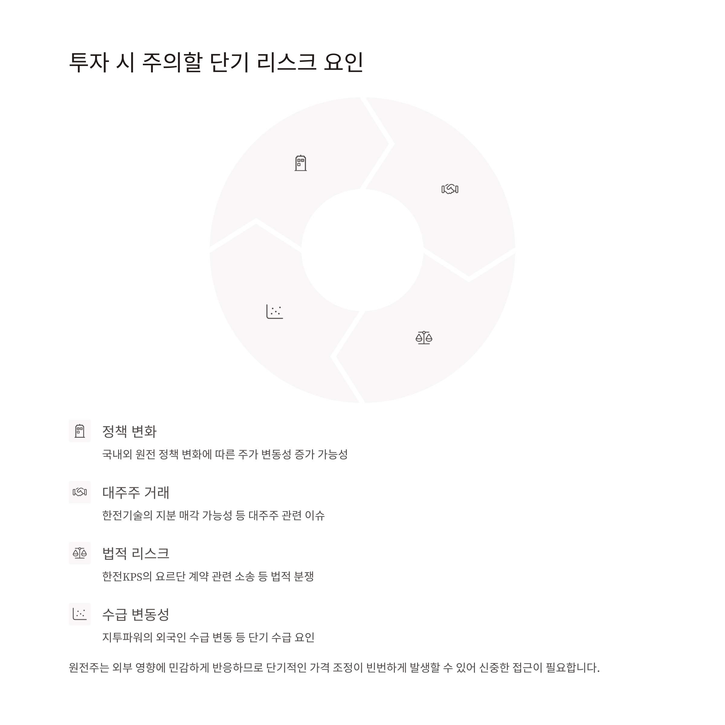 | 한전KPS | 미국 정책 수혜, 노후 원전 정비 | 법적 리스크, 단기 조정 | 안정적 수익 기반, 장기 성장 |