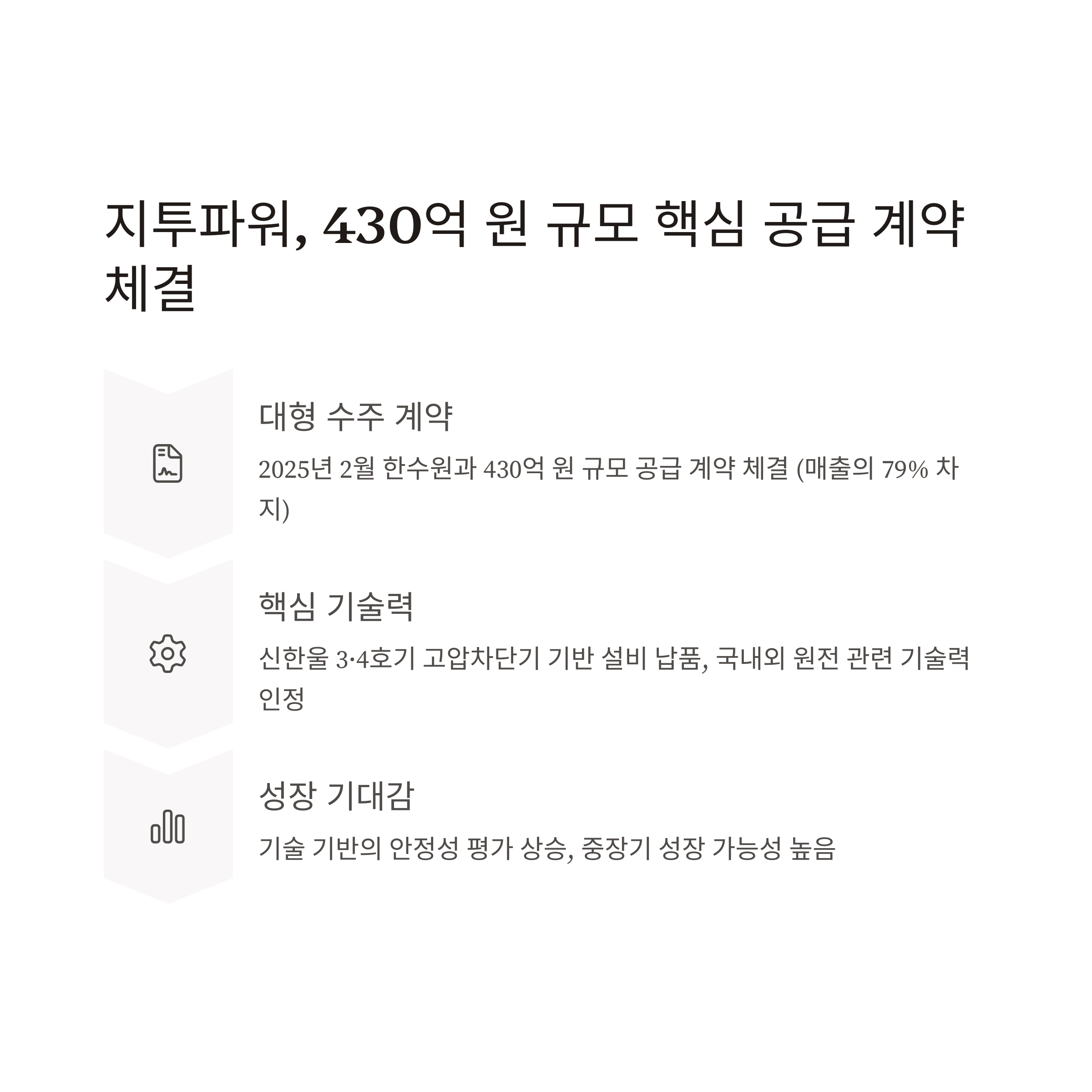 지투파워는 2025년 2월 한수원과 430억 원 규모의 공급 계약을 체결하며 단숨에 시장의 주목을 받았습니다.