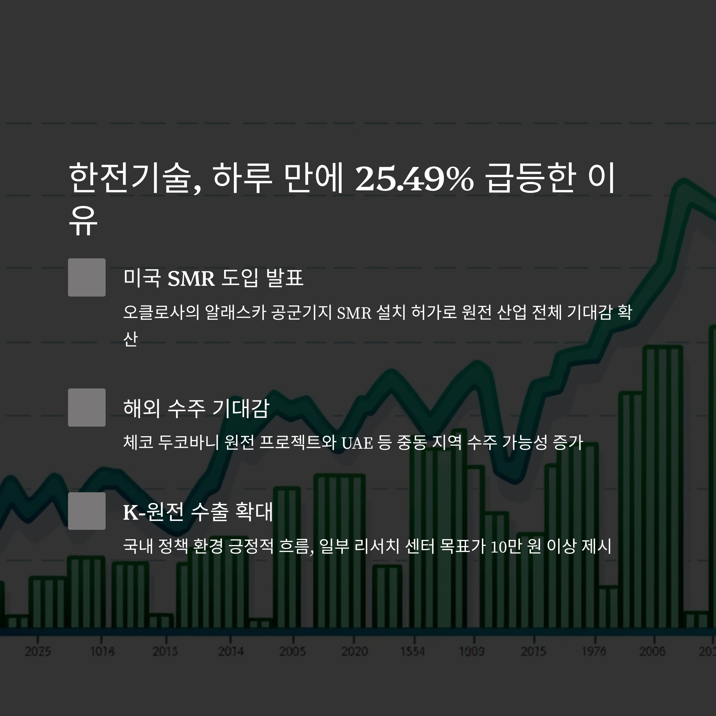 특히 미국의 소형모듈원자로(SMR) 정책, 체코 및 중동 원전 수주 기대감 등 다양한 요인이 겹치며 시장 분위기가 심상치 않은데요. 오늘은 한전기술, 한전KPS, 지투파워 이 세 종목이 왜 이슈가 되는지,