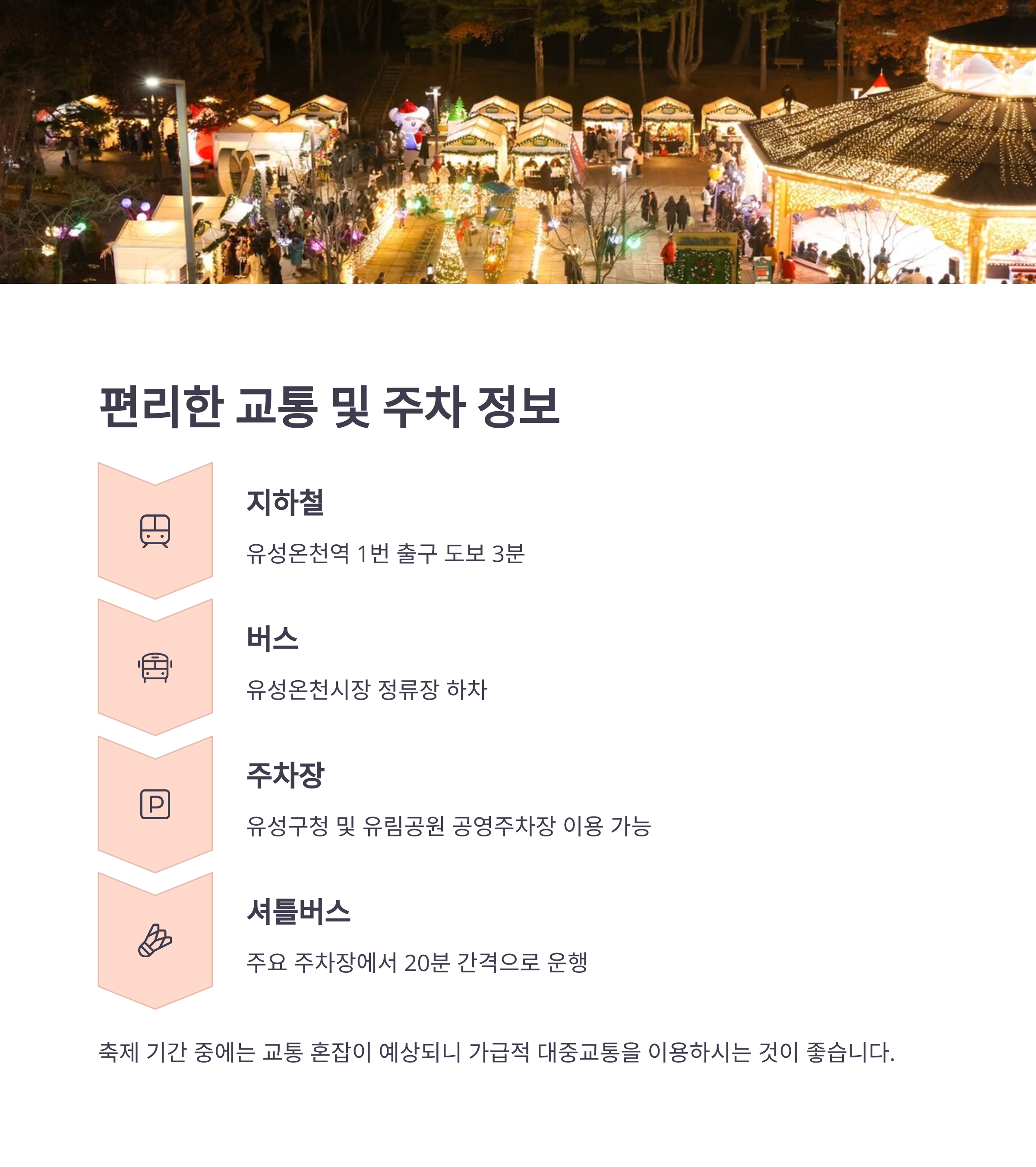 - 주차장: 유성구청 및 유림공원 공영주차장 이용 가능 (축제 셔틀버스 운영)