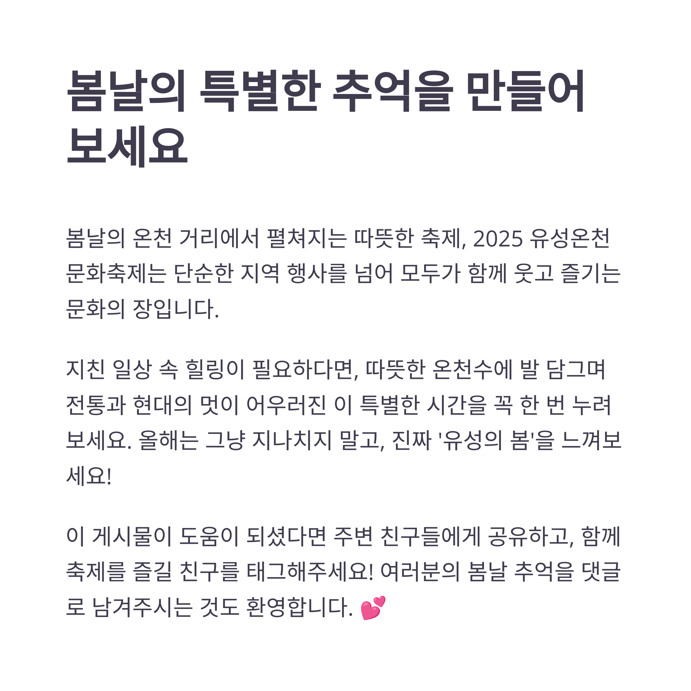 봄날의 온천 거리에서 펼쳐지는 따뜻한 축제, 2025 유성온천문화축제는 단순한 지역 행사를 넘어 모두가 함께 웃고 즐기는 문화의 장입니다. 지친 일상 속 힐링이 필요하다면, 따뜻한 온천수에 발 담그며 전통과 현대의 멋이 어우러진 이 특별한 시간을 꼭 한 번 누려보시길 추천드려요. 올해는 그냥 지나치지 말고, 진짜 ‘유성의 봄’을 느껴보세요!