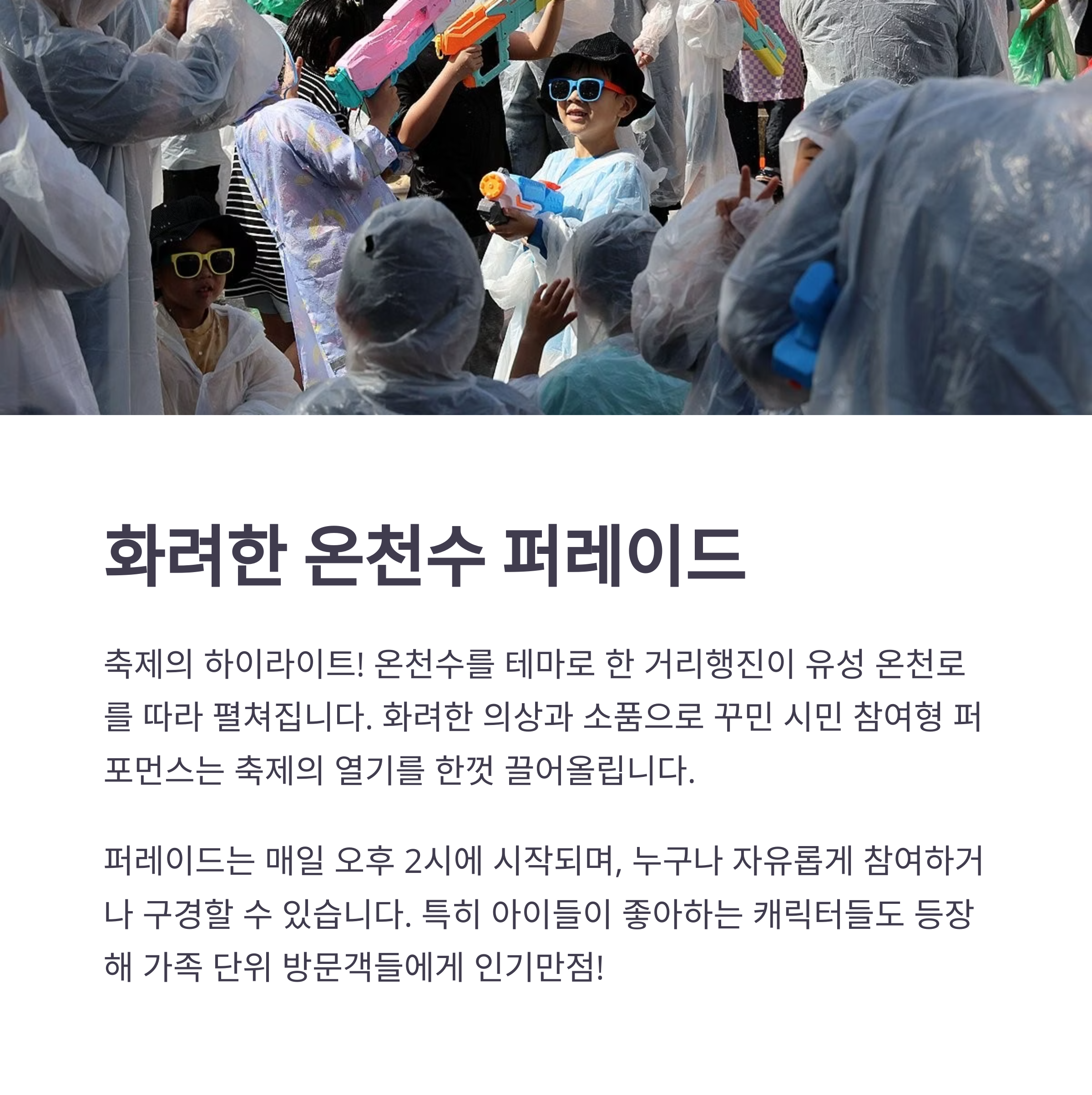 | 온천수 퍼레이드 | 온천수를 테마로 한 거리행진, 시민 참여형 퍼포먼스 |