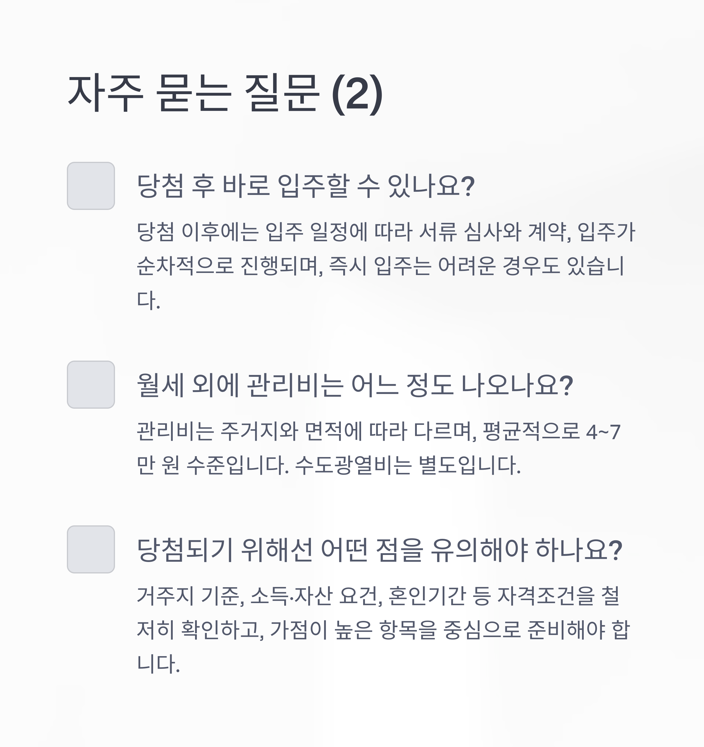 당첨 이후에는 입주 일정에 따라 서류 심사와 계약, 입주가 순차적으로 진행되며, 즉시 입주는 어려운 경우도 있습니다.