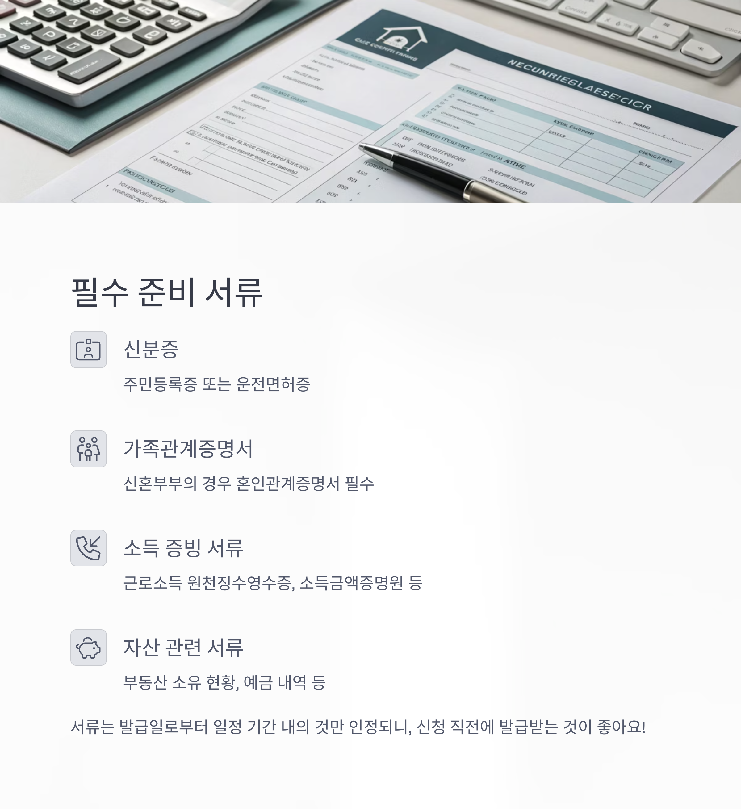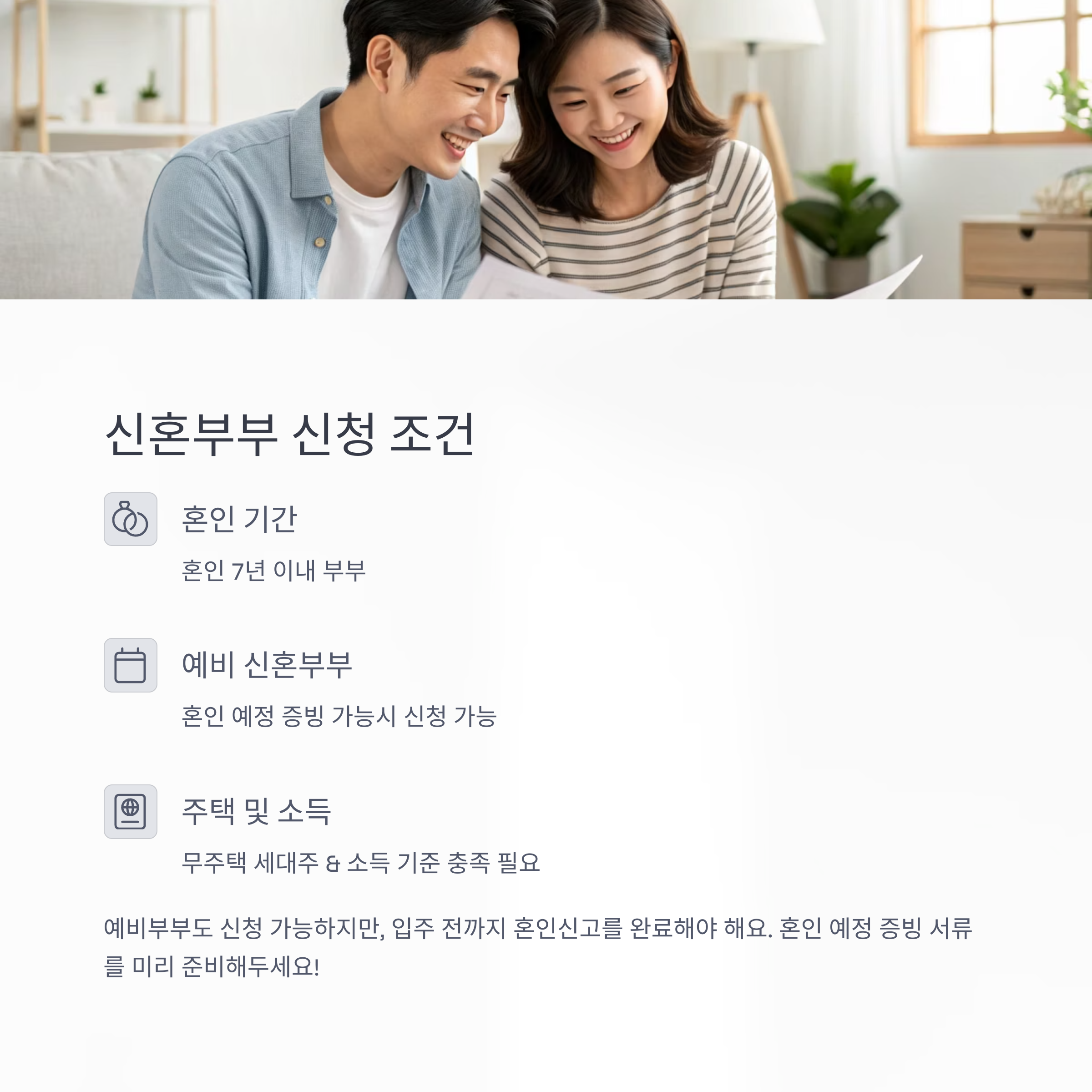 거주지 기준, 소득·자산 요건, 혼인기간 등 자격조건을 철저히 확인하고, 가점이 높은 항목을 중심으로 준비해야 합니다.
