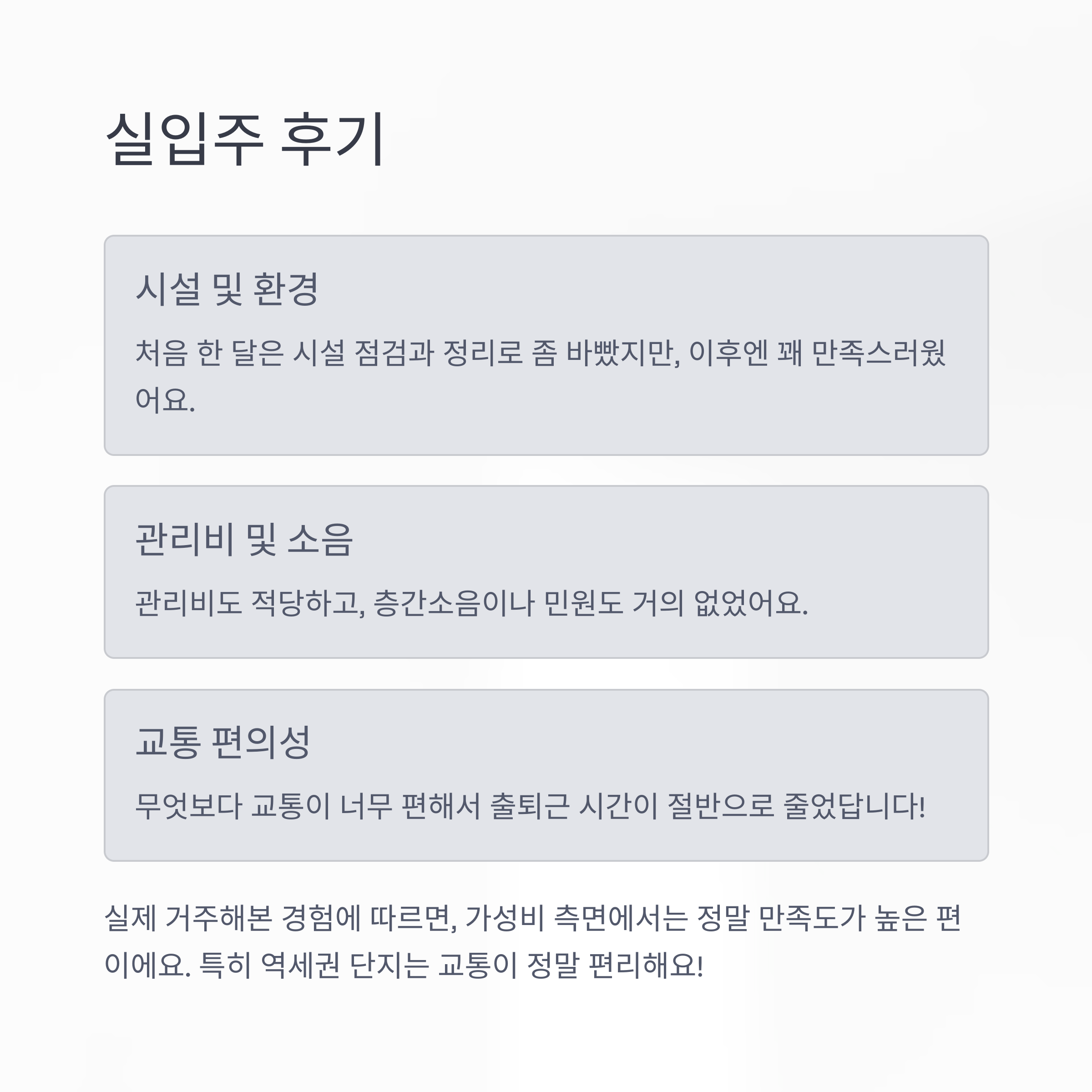 - 관리비도 적당하고, 층간소음이나 민원도 거의 없었어요.