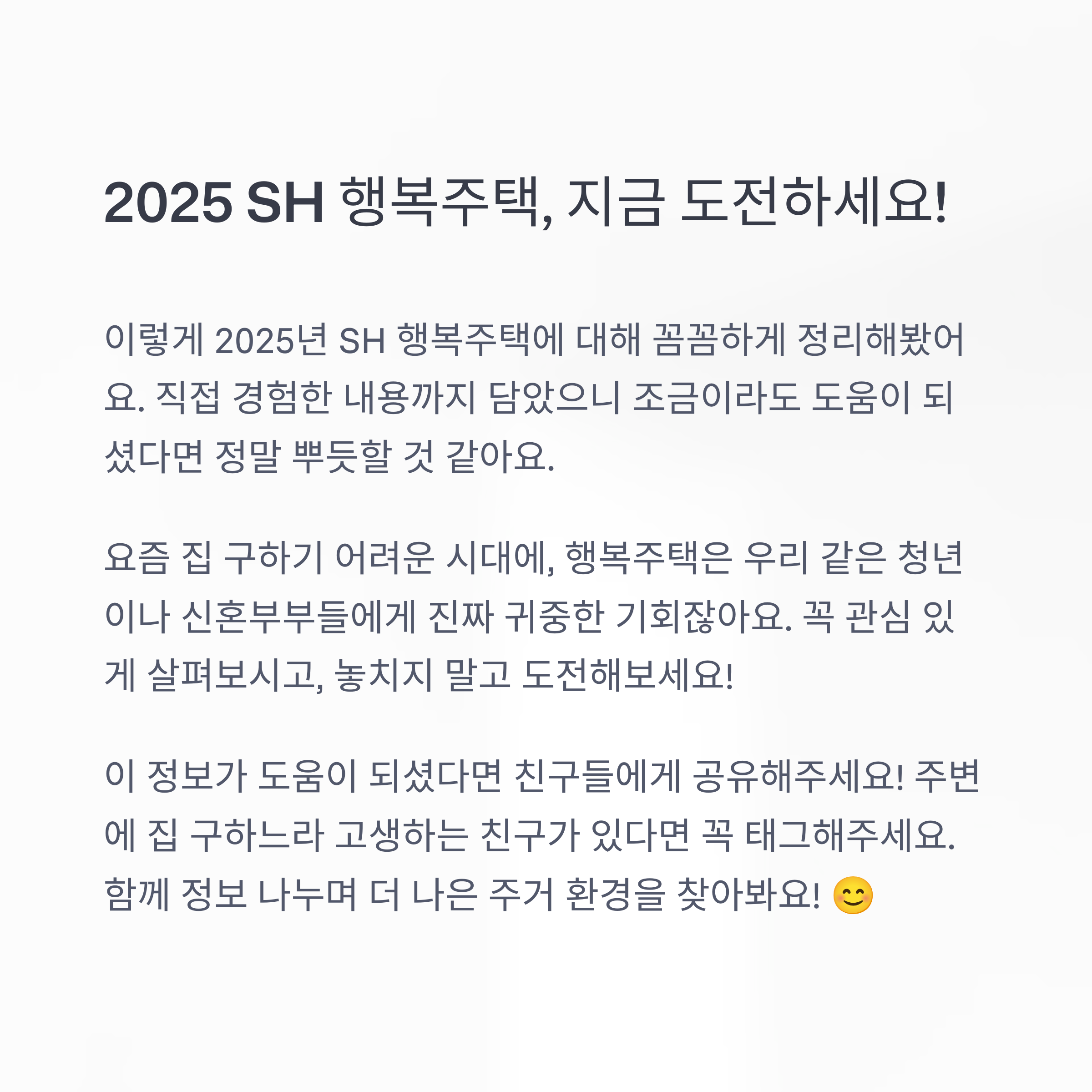 이렇게 2025년 SH 행복주택에 대해 꼼꼼하게 정리해봤어요. 직접 경험한 내용까지 담았으니 조금이라도 도움이 되셨다면 정말 뿌듯할 것 같아요. 요즘 집 구하기 어려운 시대에, 행복주택은 우리 같은 청년이나 신혼부부들에게 진짜 귀중한 기회잖아요. 꼭 관심 있게 살펴보시고, 놓치지 말고 도전해보세요! 더 궁금한 게 있다면 댓글로 남겨주세요. 다 같이 살아가는 정보 나눔, 계속 이어가요 😊