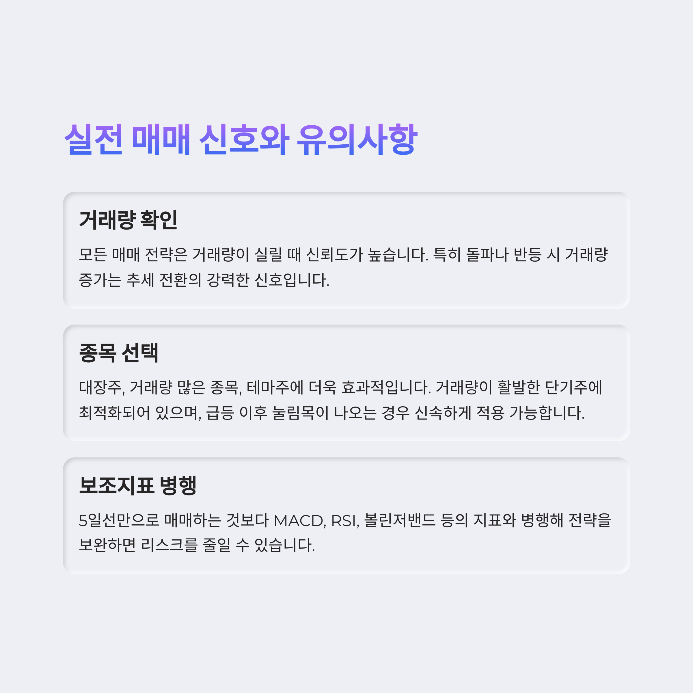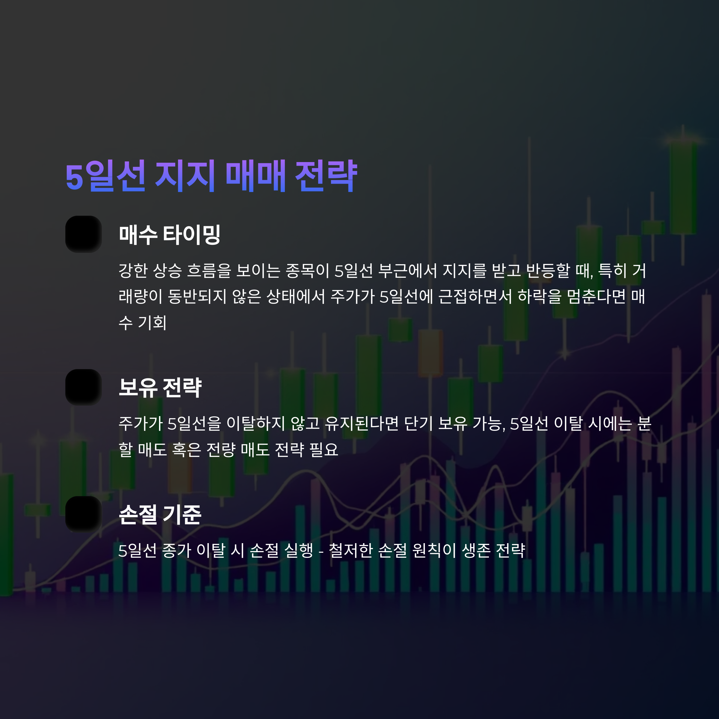 | 5일선 지지 | 상승 추세 + 거래량 감소 + 반등 | 지지 시 매수, 이탈 시 손절 |