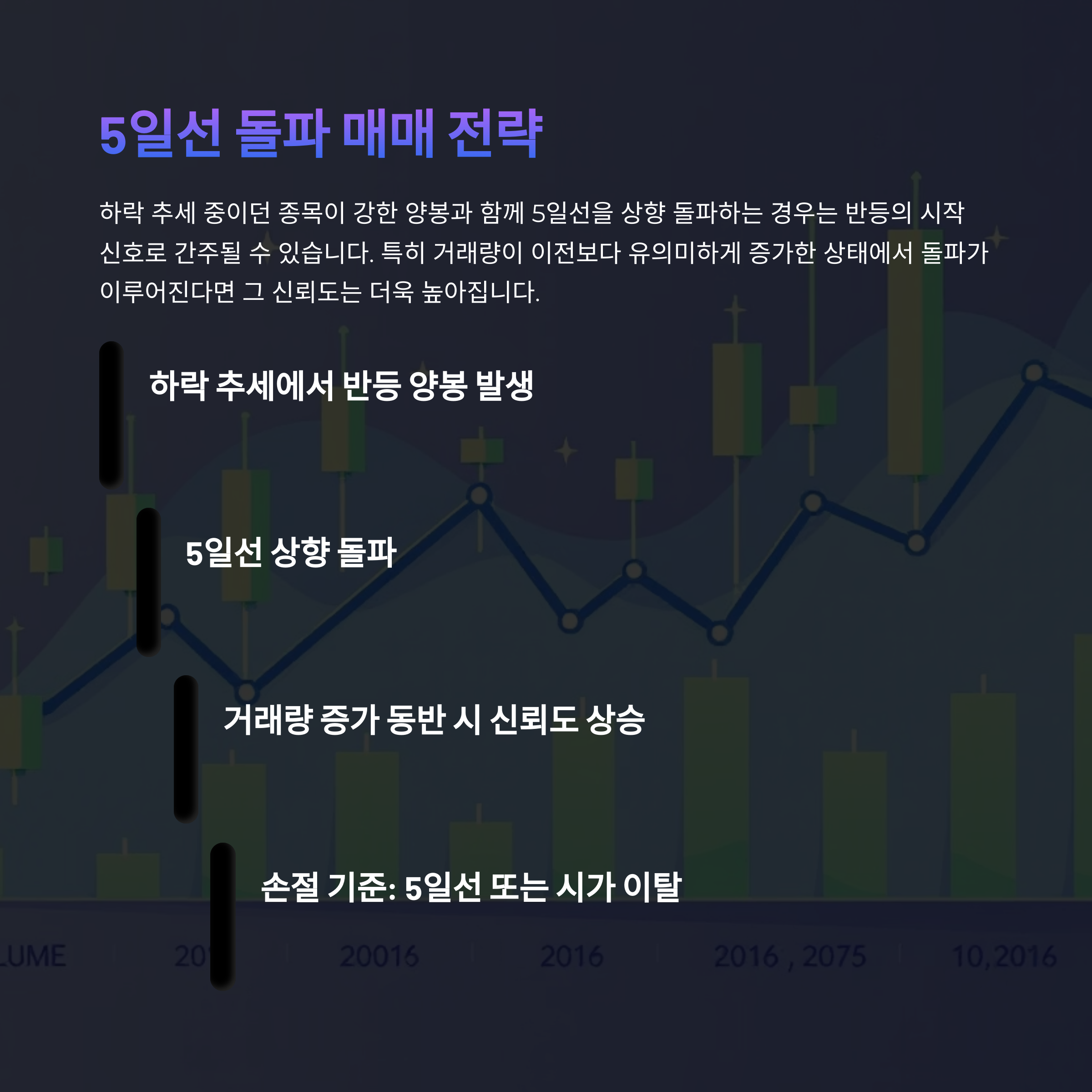 | 5일선 돌파 | 하락 추세 전환 + 강한 양봉 | 돌파 시 매수, 시가 또는 5일선 손절 |