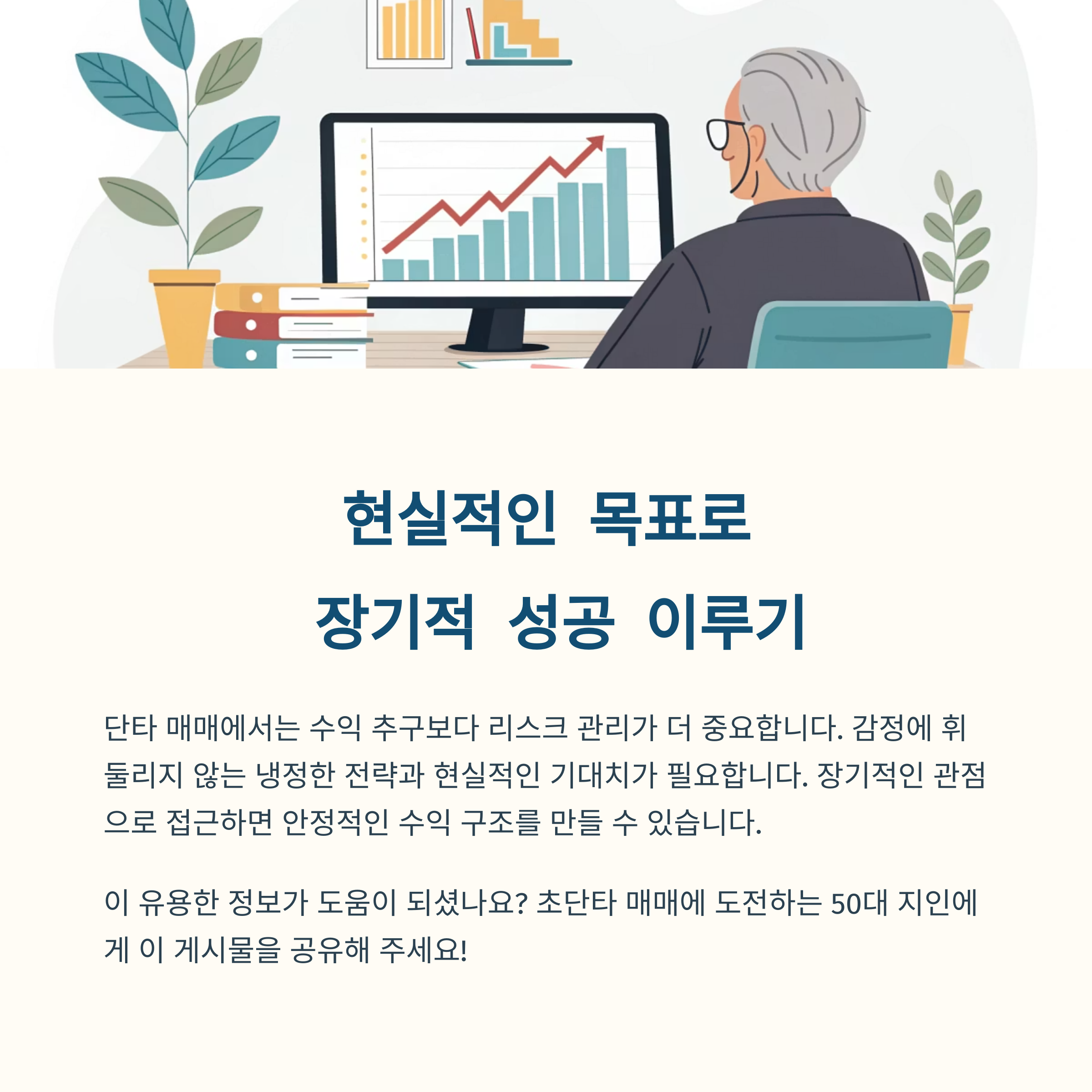단타의 본질은 손실을 감수할 수 있는 자금 여유에서 출발합니다. ‘조금 손해 봐도 괜찮다’는 마음이 아니라면, 단타는 결코 추천드릴 수 없습니다. 50대 이후에는 현금흐름보다 자산 안정성이 중요해지고, 단 한 번의 큰 손실이 은퇴자산에 직접적인 타격을 줍니다. 반드시 소액으로 시작하고, 매매마다 손절라인을 명확히 설정하며, 총 투자금의 10% 이상을 단타에 노출시키지 않는 것을 원칙으로 삼으시길 권합니다.