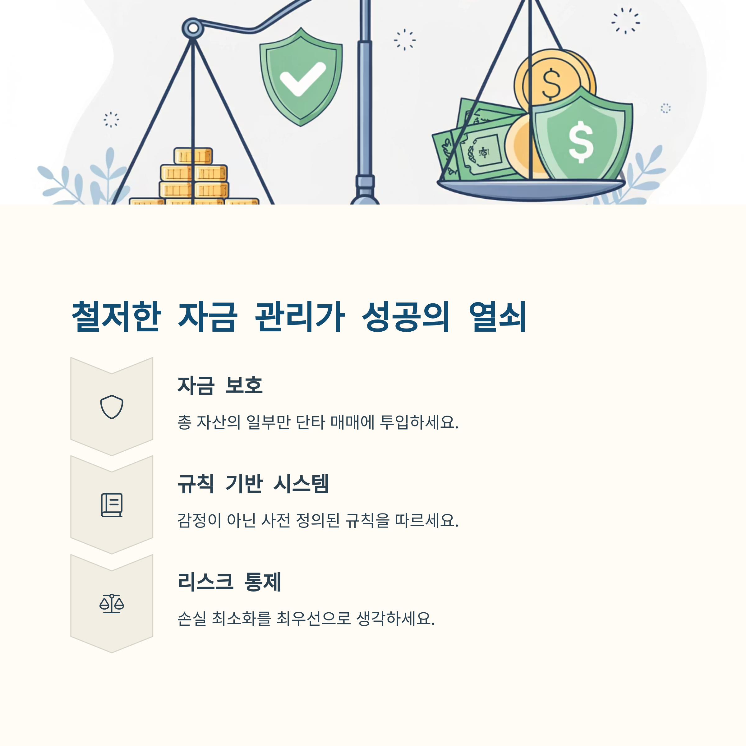 철저한 매매 규칙, 냉정한 손절 실천, 지속적인 복기와 훈련이 핵심입니다.