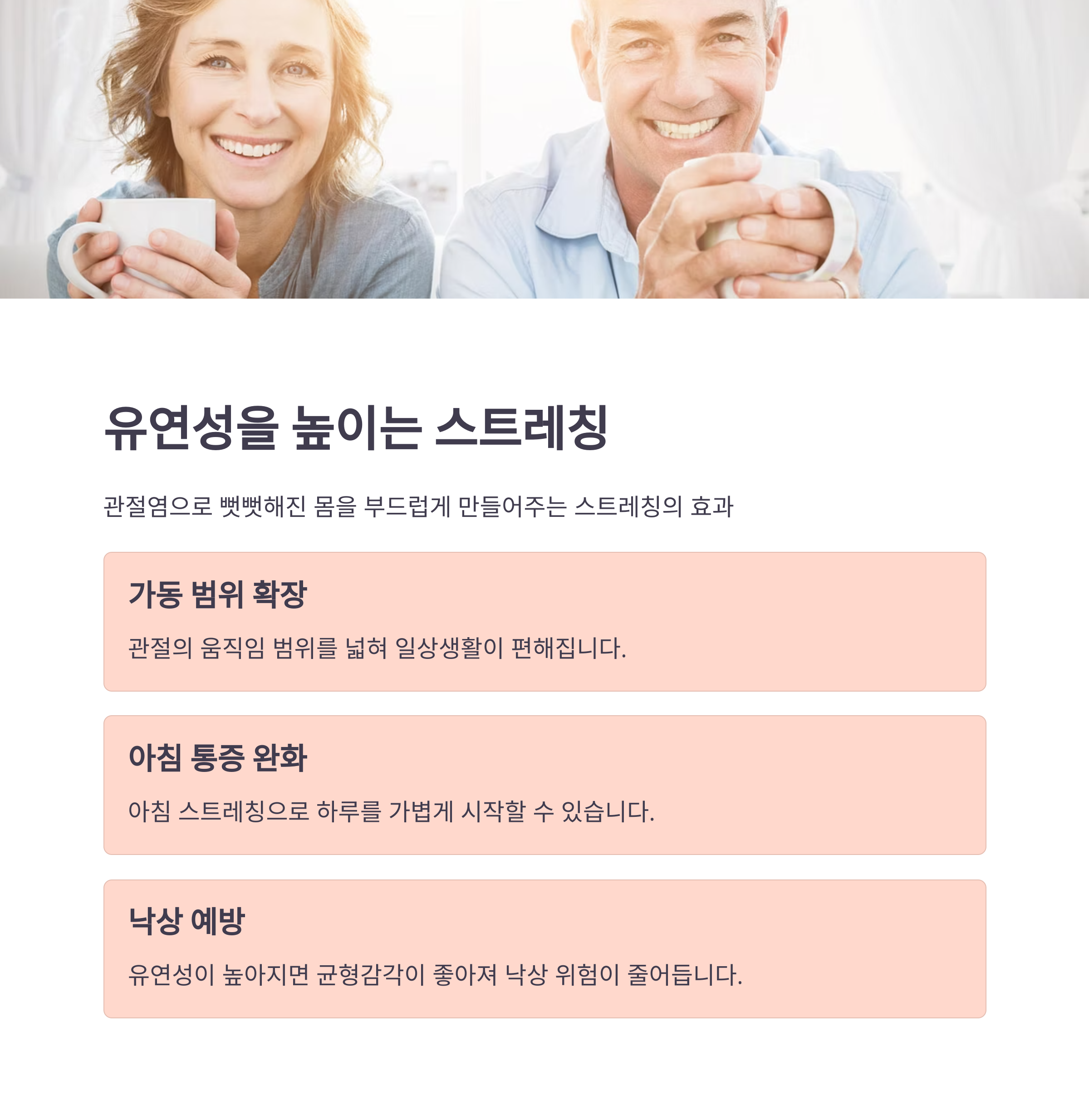 저도 사실 2년 전부터 관절이 아파서 운동은커녕 산책도 꺼려졌었어요. 그런데 병원에서 알려준 간단한 스트레칭과 운동을 따라하면서 통증이 정말 많이 줄었답니다.