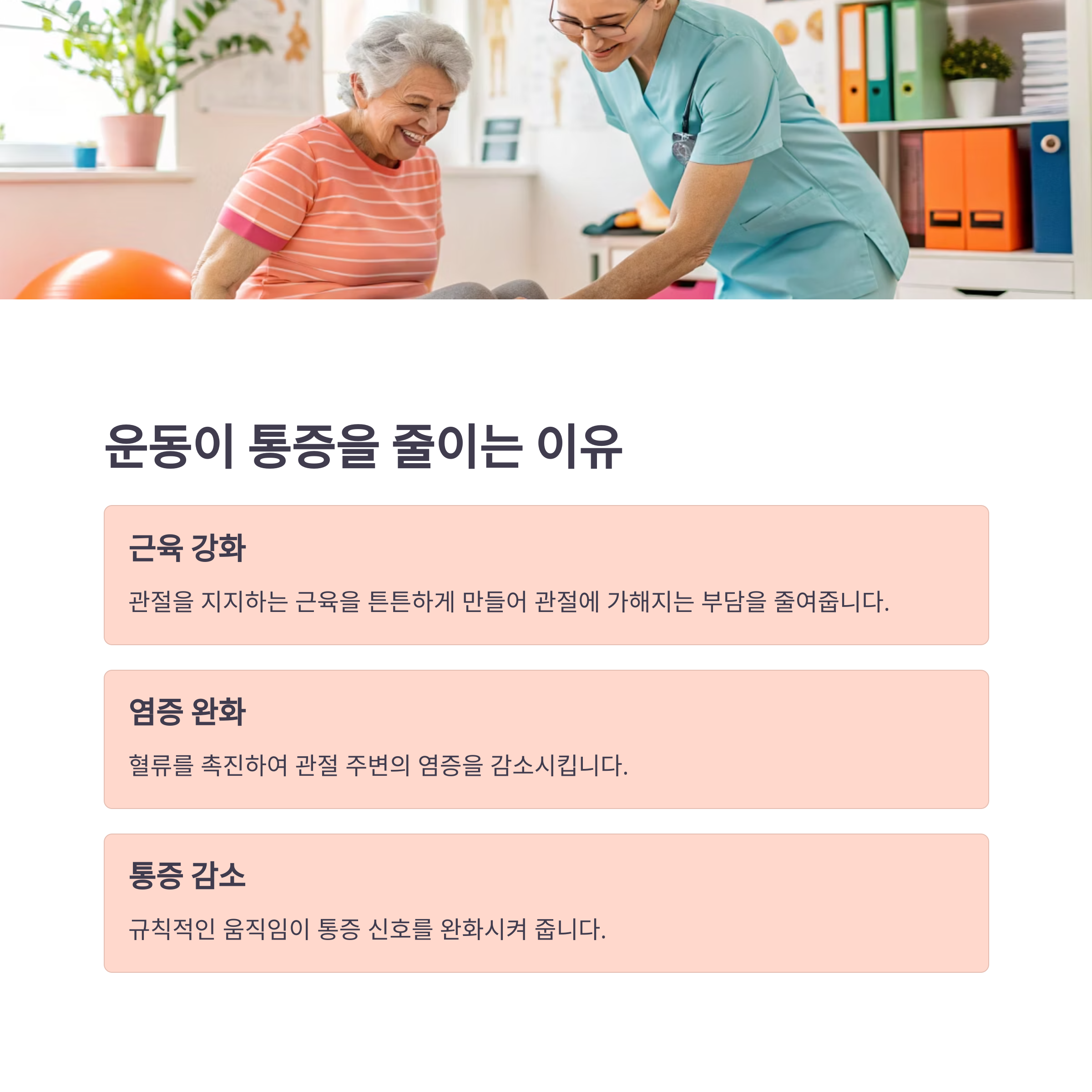 많은 분들이 "관절 아픈데 어떻게 운동해?"라고 하시지만, 사실 적절한 운동은 관절염 통증을 줄이는 데 아주 효과적이에요.