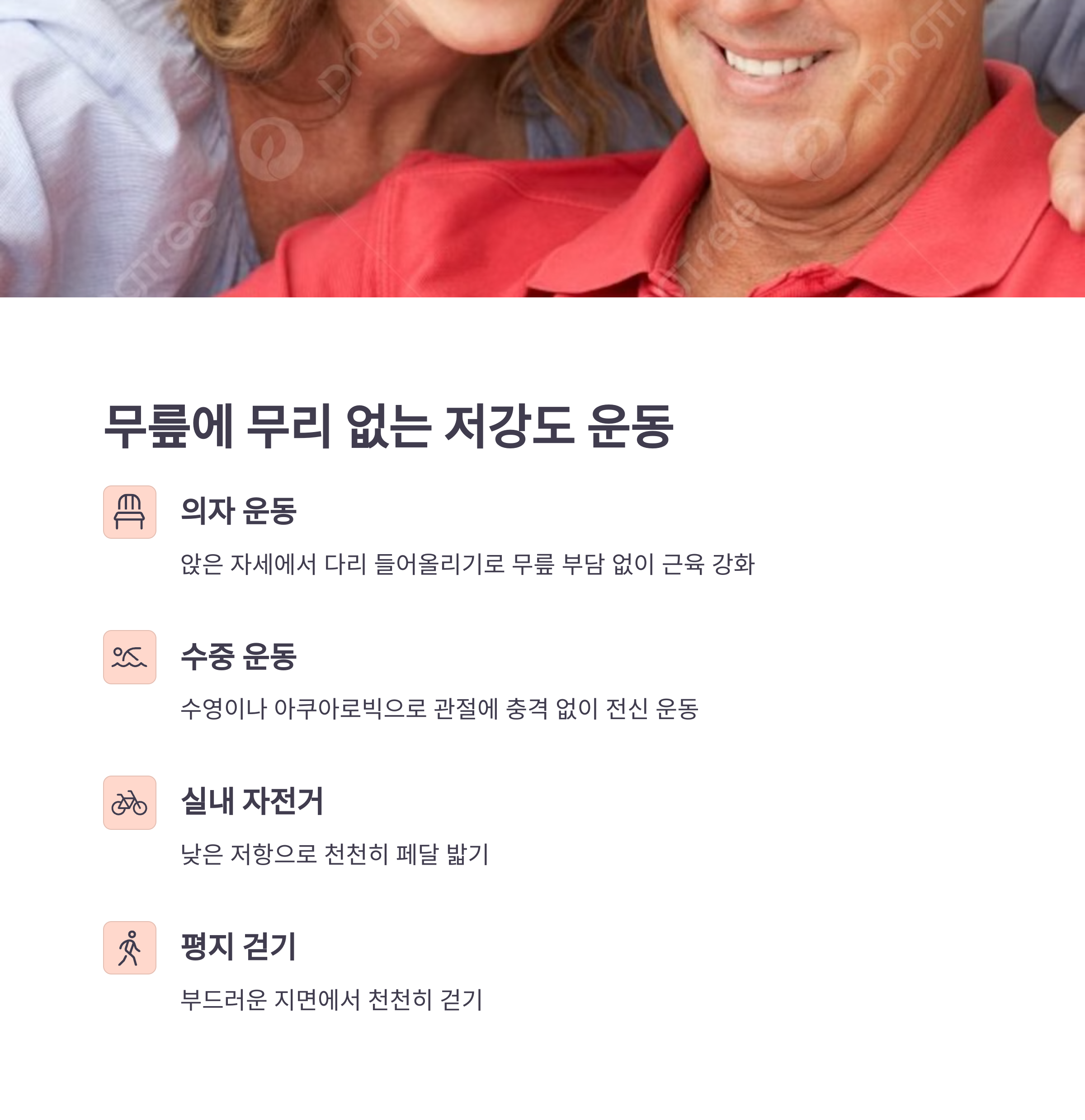 관절염이 있는 분들에겐 관절에 무리를 주지 않는 운동이 핵심이에요.