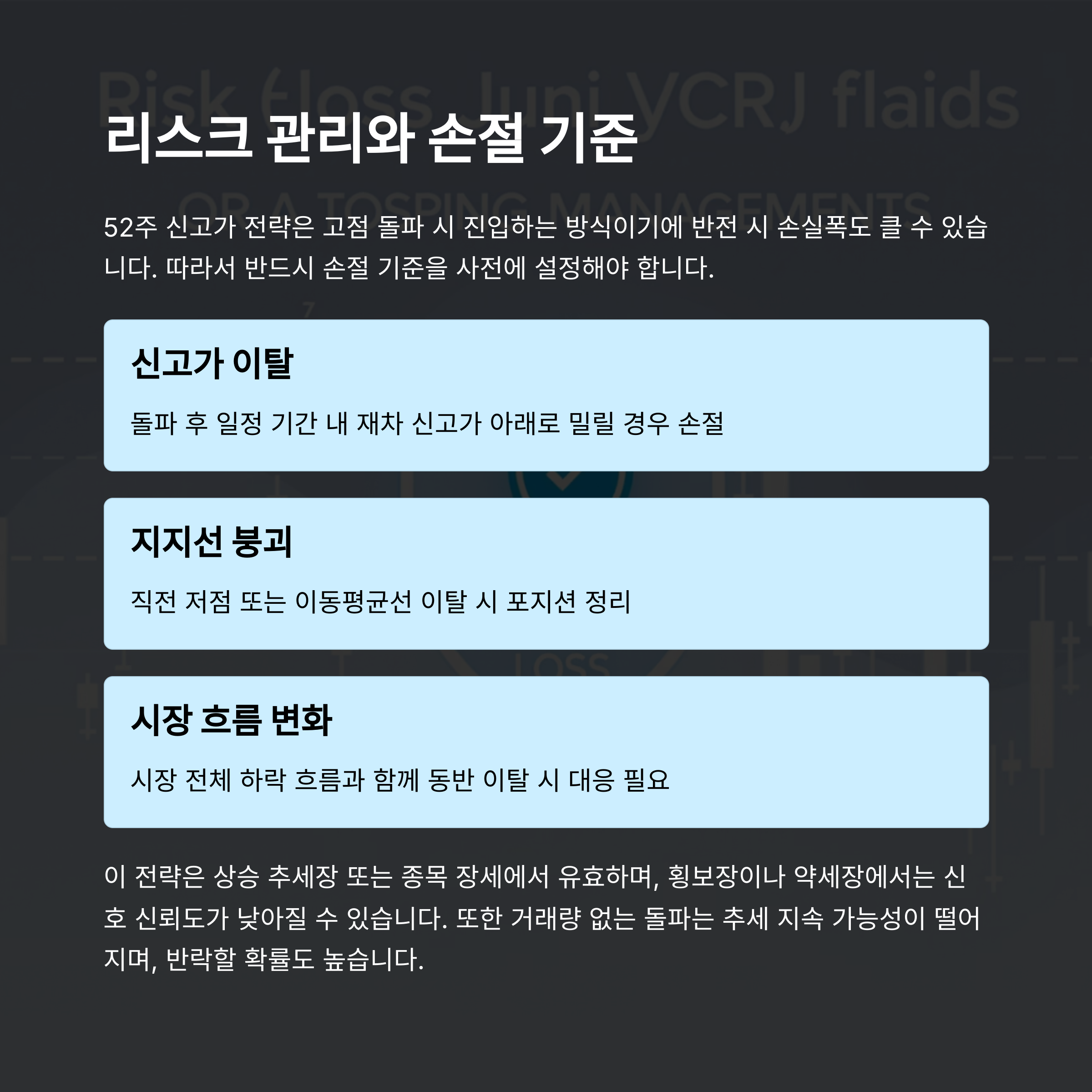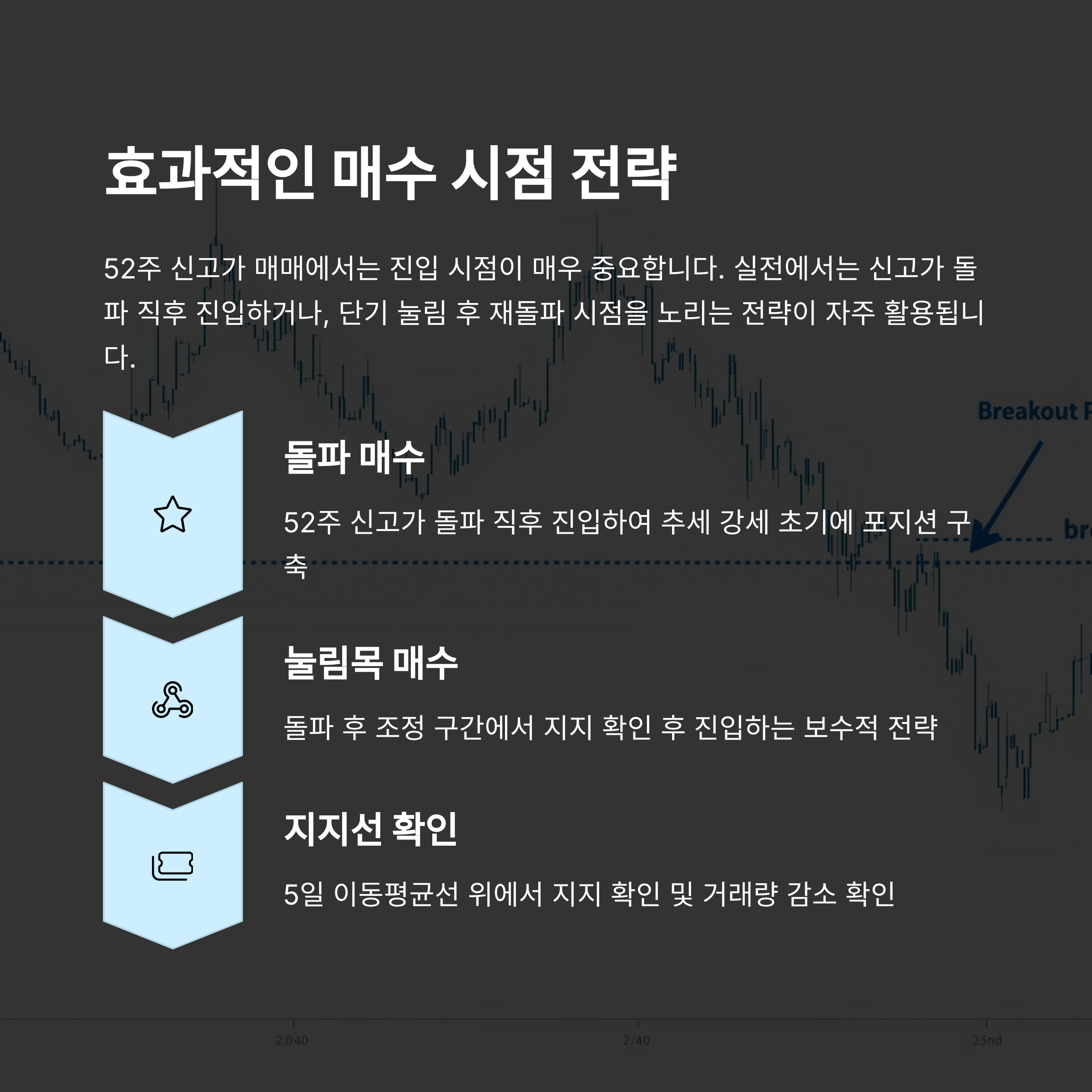 | 돌파 매수 | 52주 신고가 돌파 직후 | 추세 강세 초기 진입 |