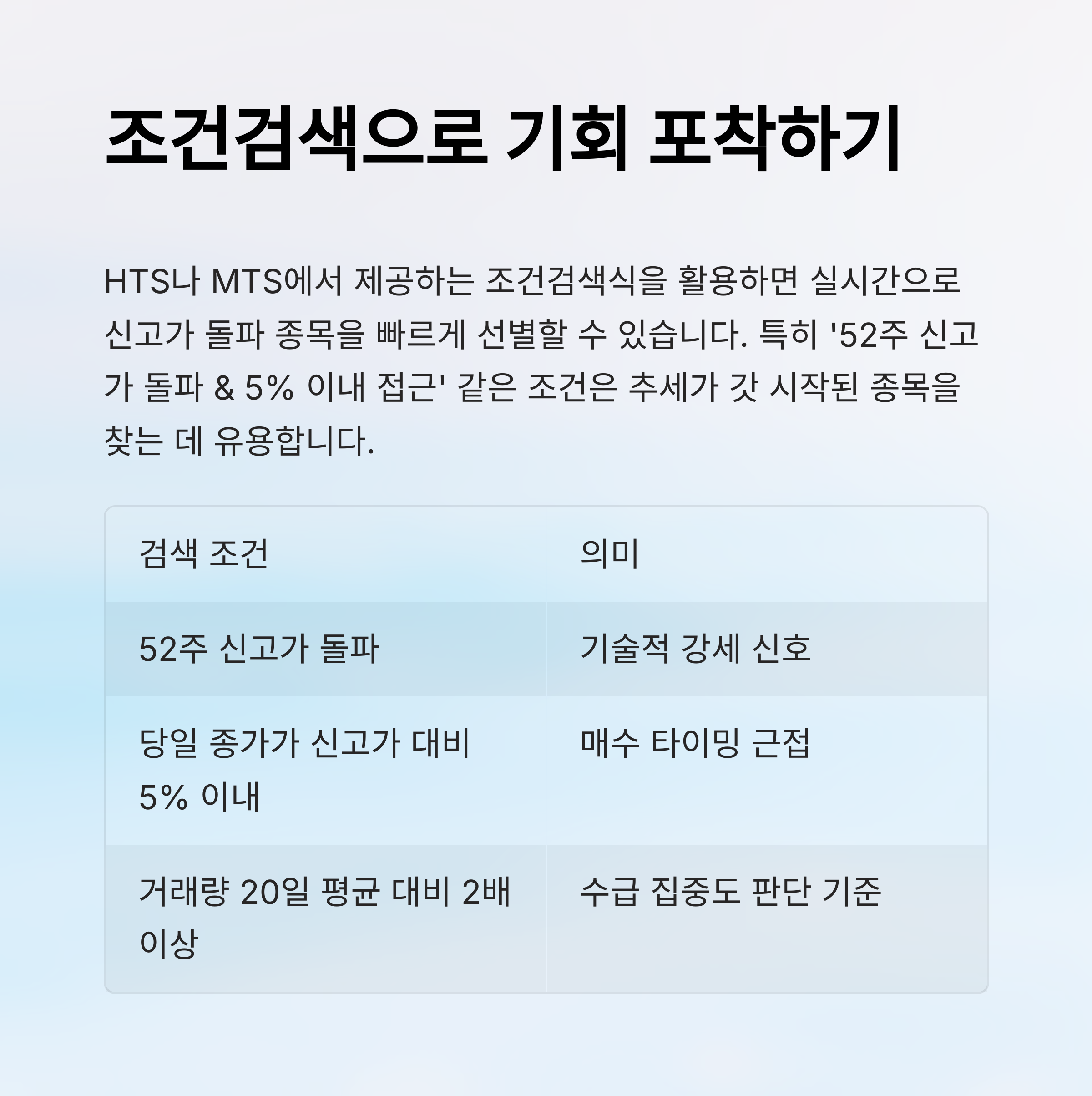 HTS나 MTS에서 제공하는 조건검색식을 활용하면 실시간으로 신고가 돌파 종목을 빠르게 선별할 수 있습니다.