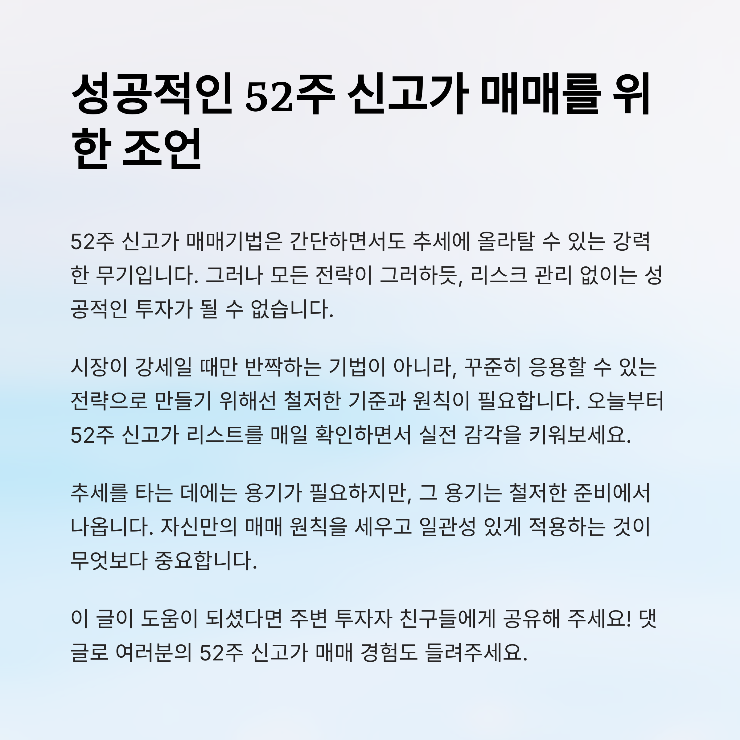 여러분도 오늘부터 52주 신고가 리스트를 매일 확인하면서 실전 감각을 키워보시길 바랍니다.