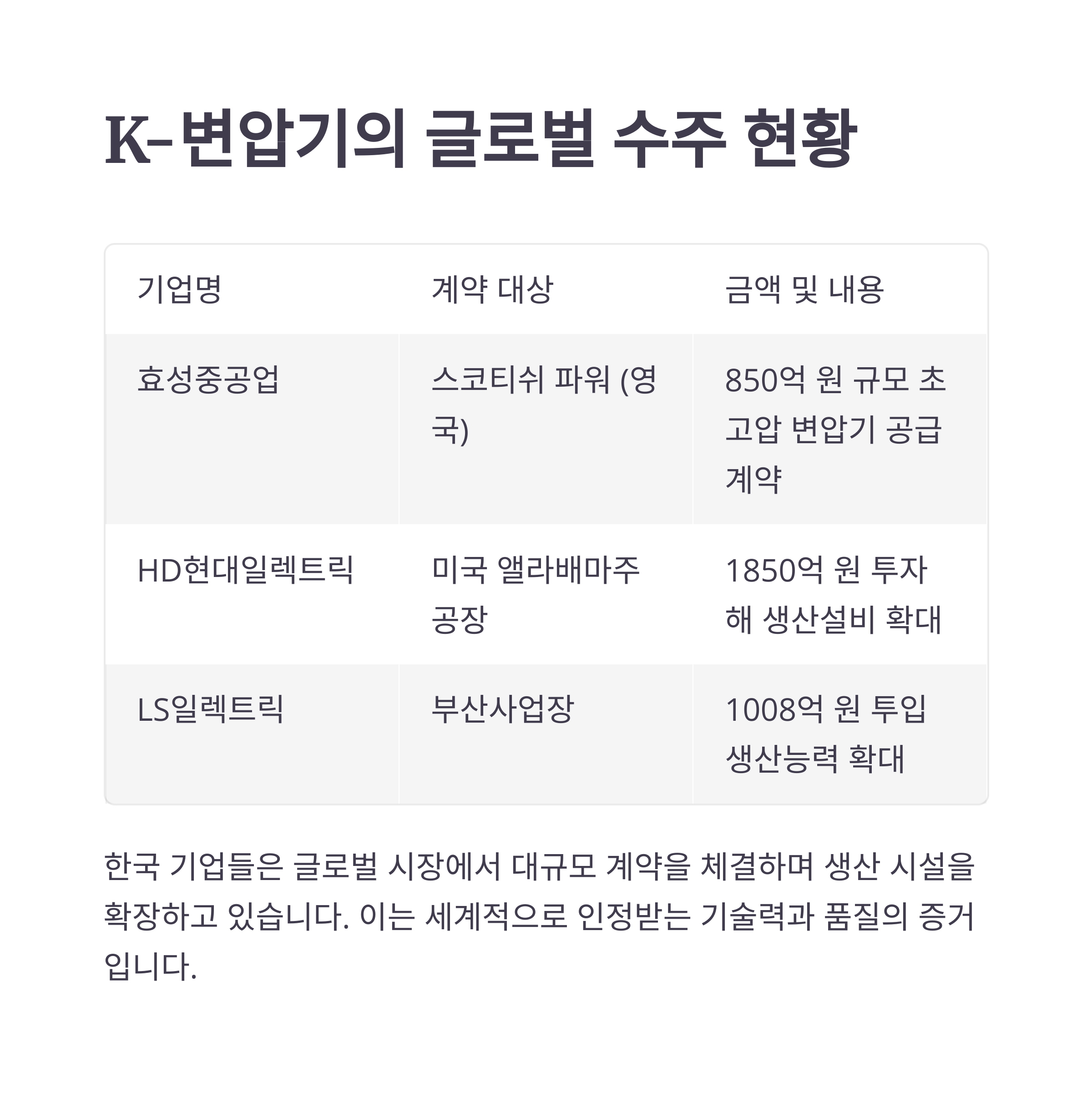 지금까지 글로벌 시장에서 존재감을 키워가고 있는 K-변압기 산업의 동향과 그 배경에 대해 살펴봤습니다.