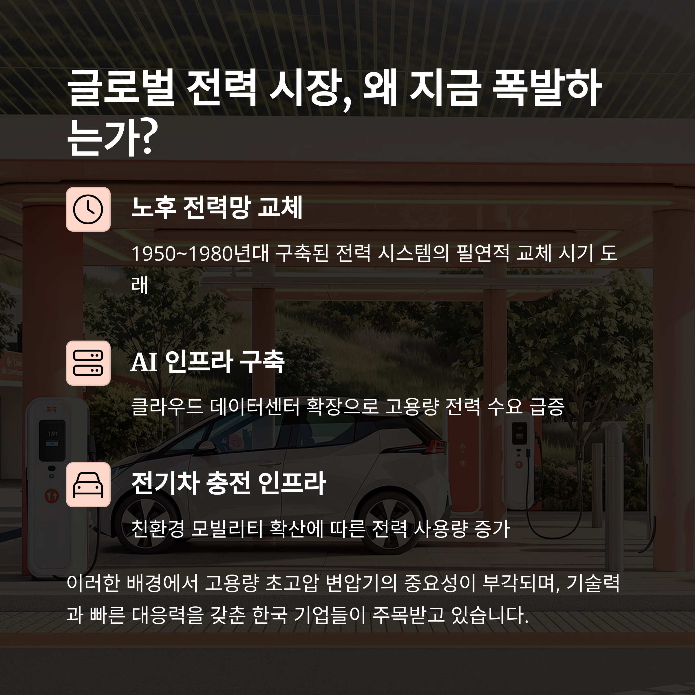 AI 인프라와 노후 전력망 교체 수요가 폭발하면서, 한국 전력기기 기업들이 글로벌 전력 시장에서 승승장구하고 있습니다.