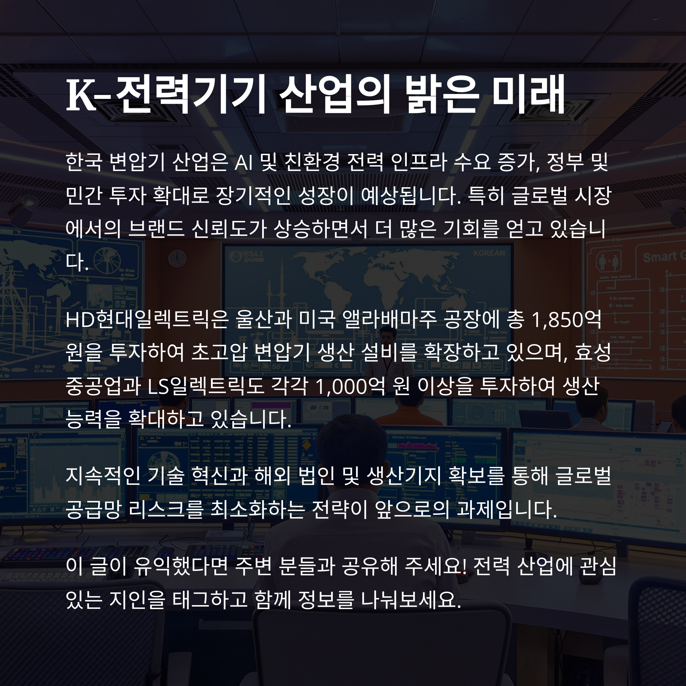 특히 K-변압기라고 불릴 정도로 고부가가치 제품의 글로벌 위상이 높아지고 있다는 점, 참 흥미롭습니다.