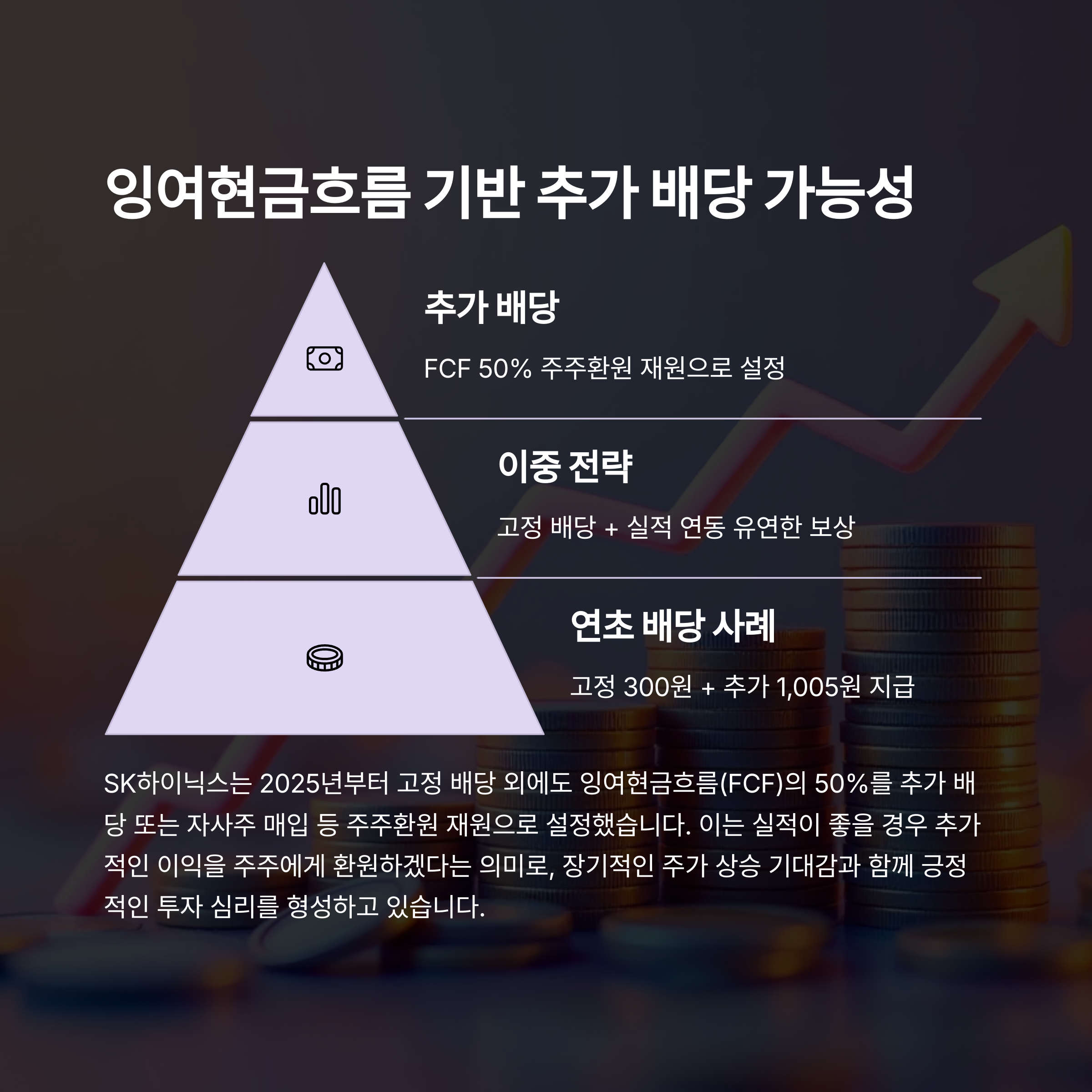 SK하이닉스는 2025년부터 고정 배당 외에 잉여현금흐름(FCF)의 50%를 추가 배당 또는 자사주 매입 등 주주환원 재원으로 설정했습니다.