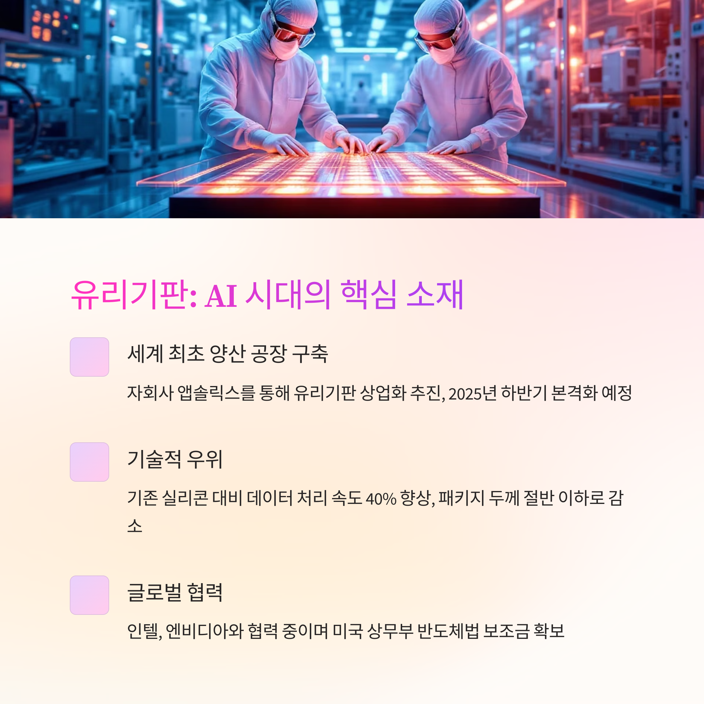 유리기판은 기존 실리콘 기판보다 데이터 처리 속도가 40% 이상 빠르고, 패키지 두께는 절반 이하로 줄일 수 있어 고성능 컴퓨팅(HPC) 및 AI 반도체에 필수적인 소재로 주목받고 있습니다.